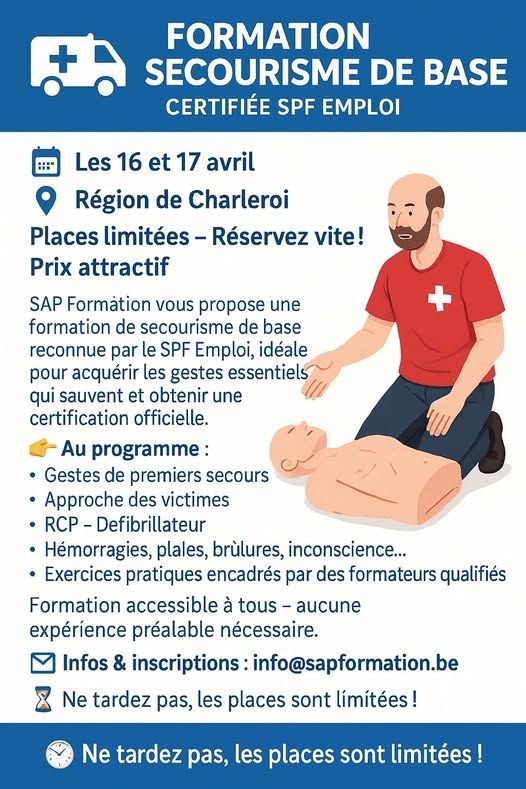 SAP Formation vous propose une formation de secourisme de base reconnue par le SPF Emploi, idéale pour acquérir les gestes essentiels qui sauvent et obtenir une certification officielle.